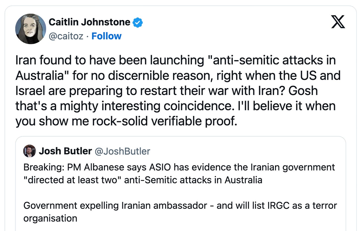 It sure was selfless of the Iranians to orchestrate these attacks against their own interests, solely to benefit the interests of Israel, just as hundreds of thousands of Australians are filling the streets in protest against Israel’s genocidal atrocities, and just as Israel prepares for war with Iran. That sure was kind and charitable of them.