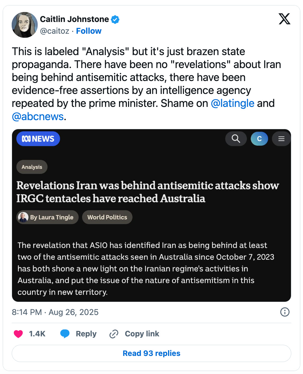 This hasn’t stopped the Murdoch press from going ballistic and framing the assertion as a “bombshell revelation” of an established fact. It also hasn’t stopped Australia’s state broadcaster the ABC from publishing an article by Laura Tingle with the flagrantly propagandistic title “Revelations Iran was behind antisemitic attacks show IRGC tentacles have reached Australia”. Evidence-free assertions made by the government are not “revelations”, and to frame them as such is journalistic malpractice.