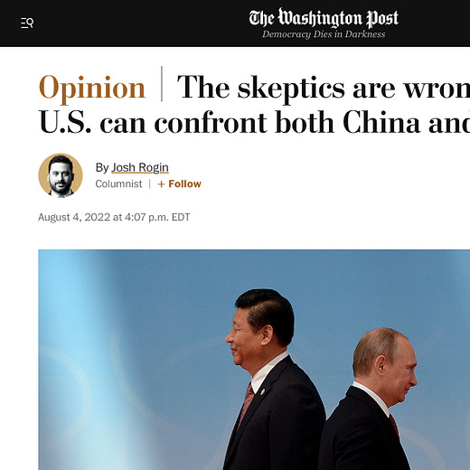 In "The skeptics are wrong: The U.S. can confront both China and Russia," The Washington Post's Josh Rogin wags his finger at Democrats who think aggressions against Russia should be prioritized and Republicans who think that military and financial attention should be devoted to China, arguing porque no los dos?