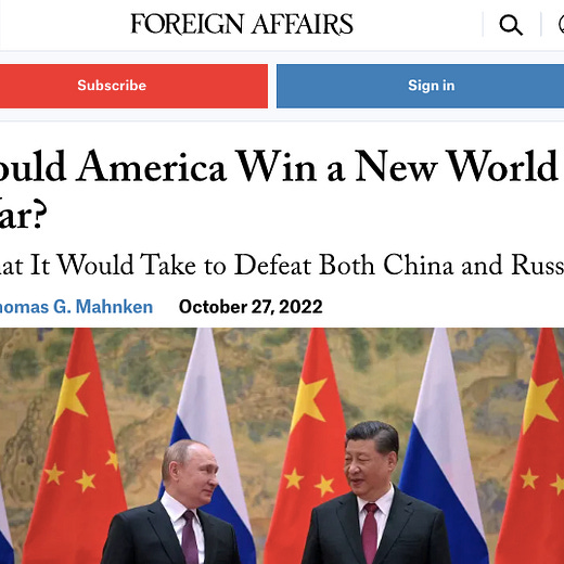The latest example of this trend is an article titled "Could America Win a New World War? — What It Would Take to Defeat Both China and Russia" published by Foreign Affairs, a magazine that is owned and operated by the supremely influential think tank Council on Foreign Relations.
