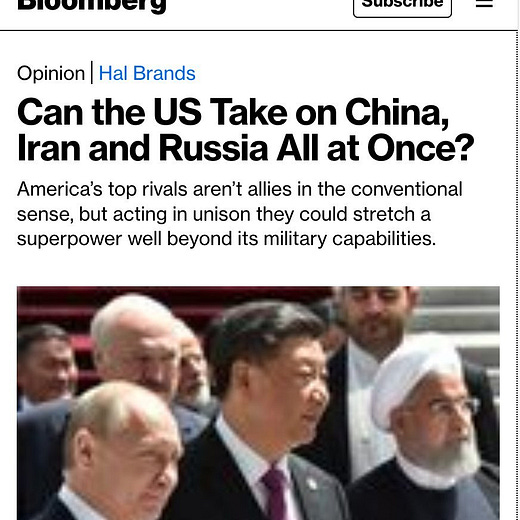 In "Can the US Take on China, Iran and Russia All at Once?" Bloomberg's Hal Brands answers that it would be very difficult and recommends escalating in Ukraine and Taiwan and selling Israel more advanced weaponry to get a step ahead of Russia, China and Iran respectively.