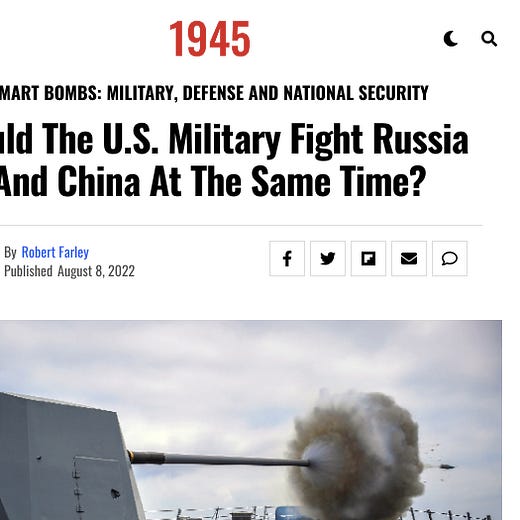 In "Could The U.S. Military Fight Russia And China At The Same Time?", 19FortyFive's Robert Farley answers in the affirmative, writing that "the immense fighting power of the US armed forces would not be inordinately strained by the need to wage war in both theaters" and concluding that "the United States can fight both Russia and China at once… for a while, and with the help of some friends."