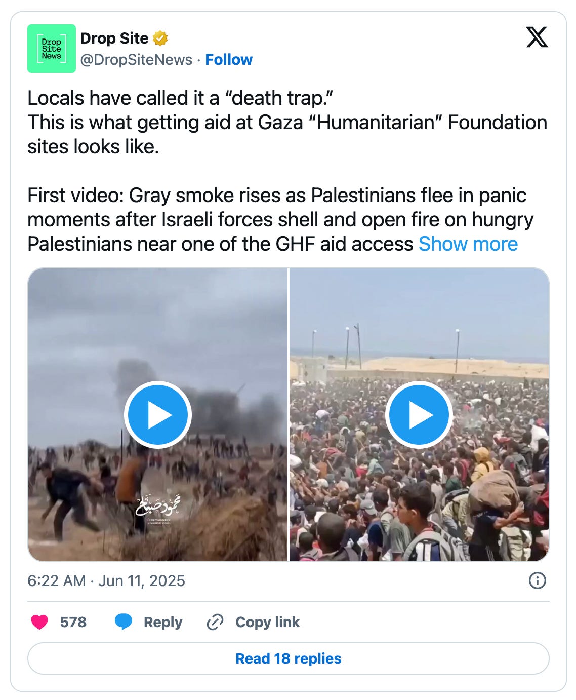 And on June 10, at least 36 people were reported killed and 208 wounded when Israeli forces again fired on crowds seeking aid in Gaza.