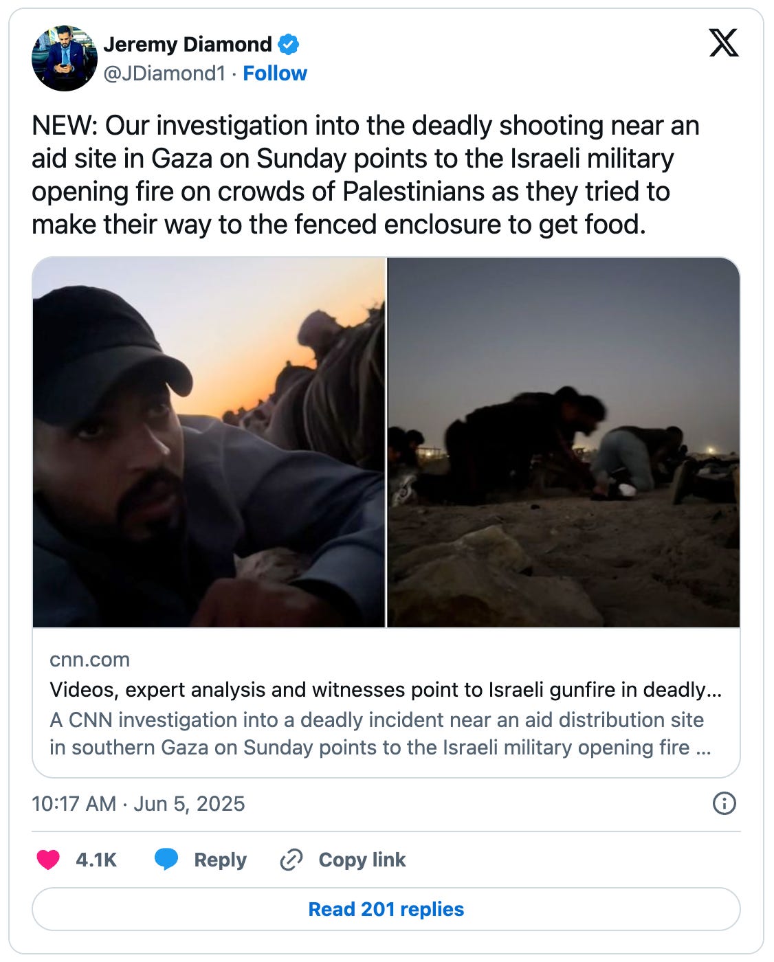 Then, a few days later, CNN published a report based on extensive video analysis and eyewitness interviews which found that all evidence, contrary to Israel’s claims, “points to the Israeli military opening fire on crowds of Palestinians as they tried to make their way to the fenced enclosure to get food.”