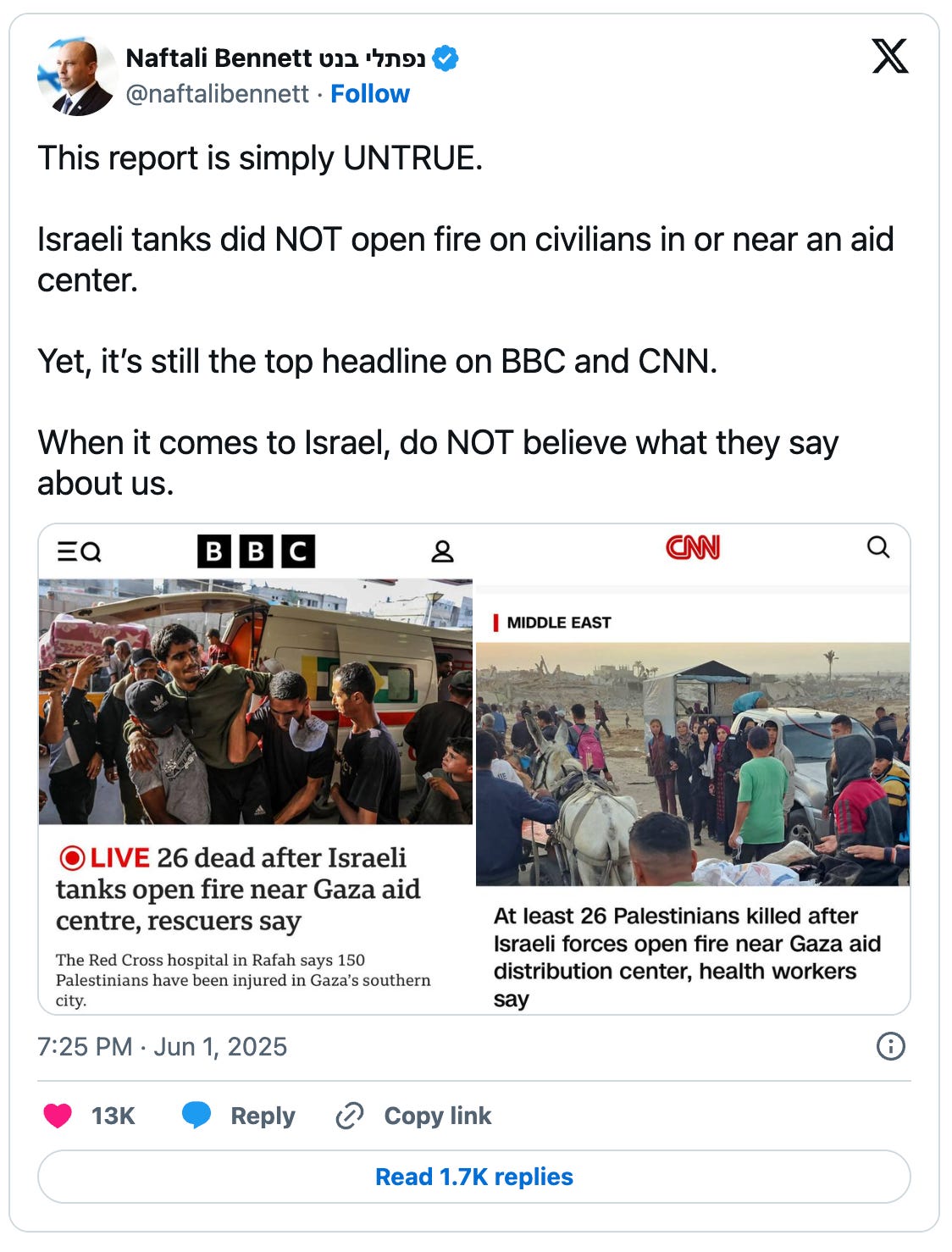 Former Israeli prime minister Naftali Bennet shared a video clip of people in Gaza not being shot at some point and claimed this proves nobody was shot at the specified incident on June 1, saying “When it’s about Israel, all slander works.”