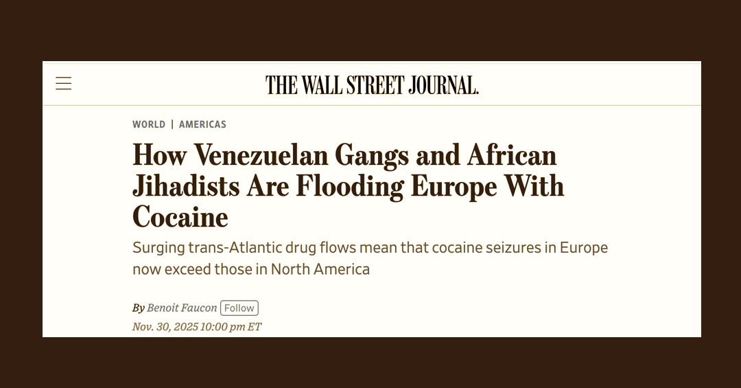 “Venezuela has become a major launchpad for huge volumes of cocaine shipped to West Africa, where jihadists are helping traffic it to Europe in record quantities,” the article begins, going out of its way to note that “the Trump administration’s pressure campaign against Venezuelan leader Nicolás Maduro — who it asserts is heavily involved in drug smuggling — has brought global attention to the country’s role in the drug trade.”