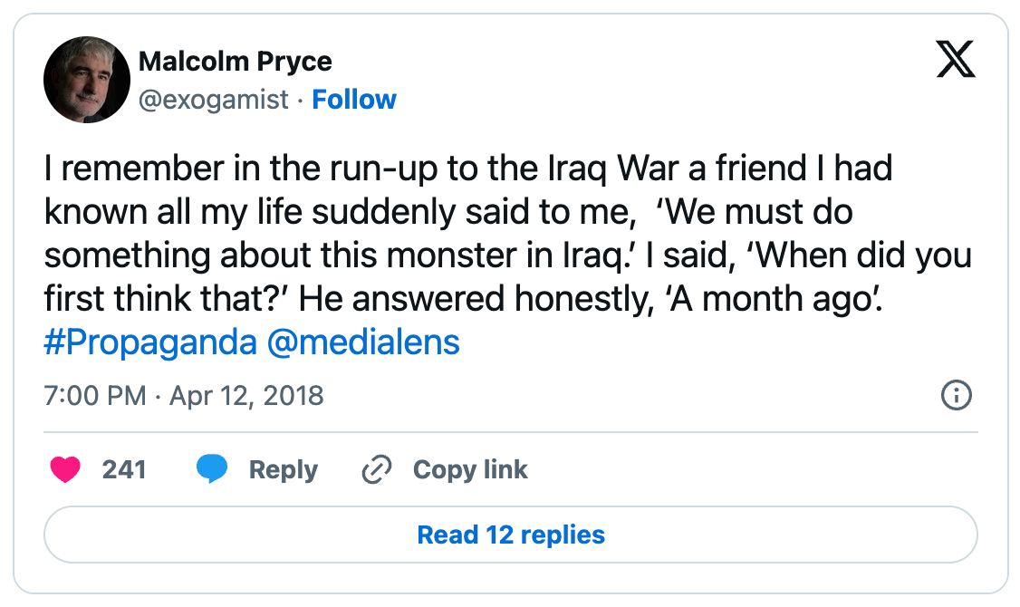 “I remember in the run-up to the Iraq War a friend I had known all my life suddenly said to me, ‘We must do something about this monster in Iraq.’ I said, ‘When did you first think that?’ He answered honestly, ‘A month ago’.”