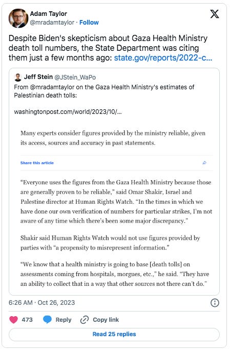 Adam Taylor, the author of the aforementioned Washington Post article, correctly notes that Biden’s statements are a bit odd given that his own State Department considered Gaza’s Ministry of Health reliable enough to cite their death counts in its own reports as recently as a few months ago.