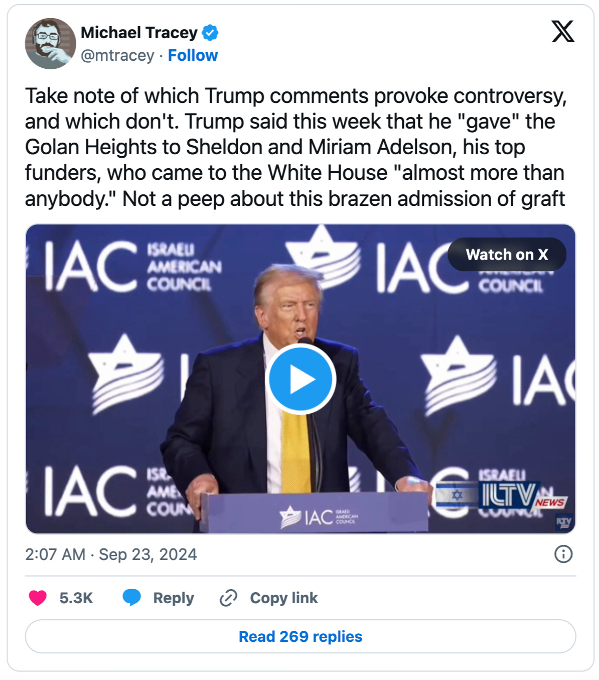 It says so much about the power of the imperial propaganda machine that Trump could openly admit to having been fully controlled by Adelson cash on the campaign trail, get elected, and then facilitate a blatant extermination campaign in Gaza while aggressively stomping out free speech that is critical of Israel throughout the United States — and somehow not have this be the main thing that everyone talks about all the time. It is only because our minds are being forcefully manipulated by the powerful at mass scale that this has been the case.