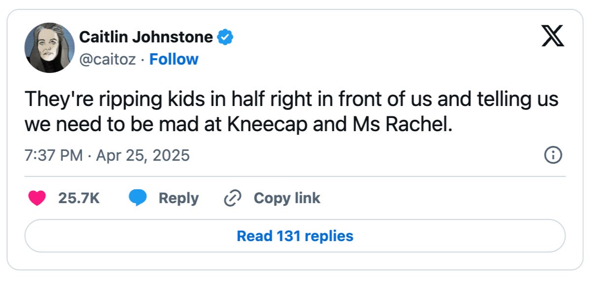 This is the dystopia we were warned about. It’s not some ominous threat looming on the horizon. It’s here. We are being psychologically manipulated at mass scale into consenting to the most nightmarish atrocities imaginable. Children’s bodies are being shredded to bits right in front of us. And when you turn on the TV you see famous people laughing and making jokes with fake plastic grins, babbling about vapid nonsense. This is the dystopia. It isn’t on its way. It’s here.