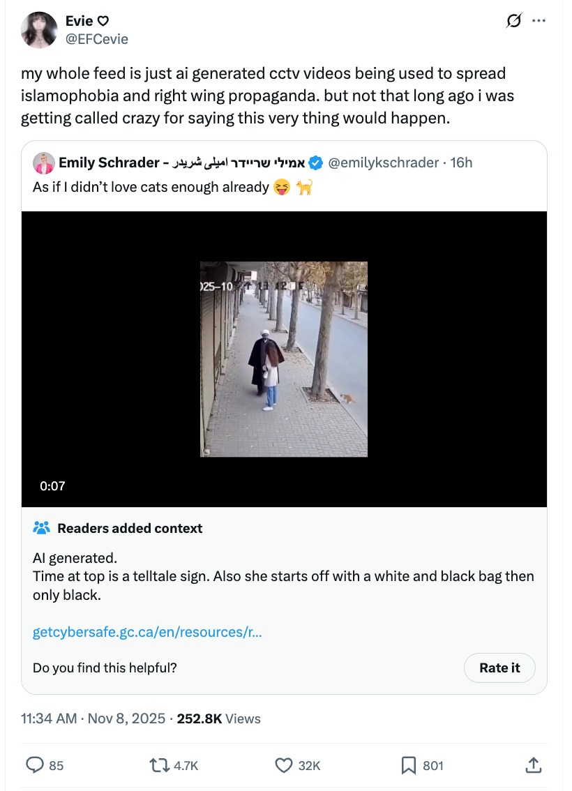 Just today I saw two viral tweets that had received Community Notes from Twitter users warning that the posts featured AI-generated videos. Both were shared by right wing accounts with large followings, and both were used to spread Islamophobia.