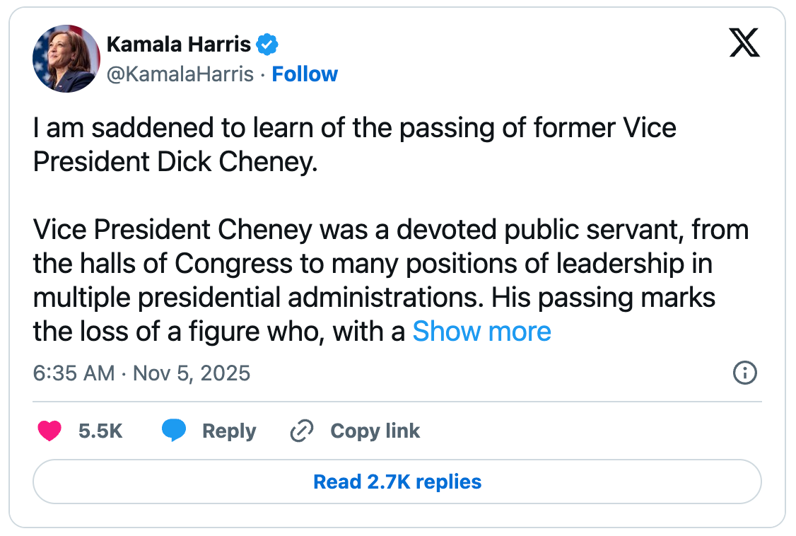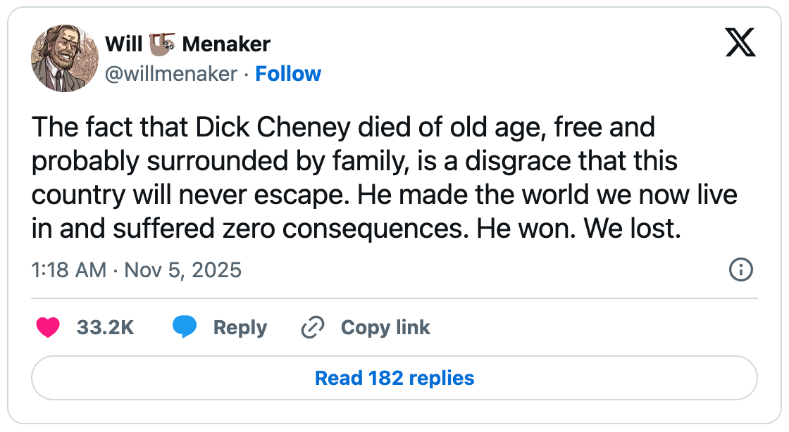 Dick Cheney died far too old and far too free. The fact that such monsters get to pass away in their eighties surrounded by loved ones instead of alone in a cage is an indictment of our entire civilization.
