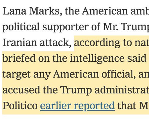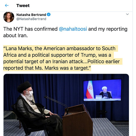 "The NYT has confirmed Nahal Toosi and my reporting about Iran," Bertrand tweeted today with a link to a new Times article, quoting the excerpt "Lana Marks, the American ambassador to South Africa and a political supporter of Trump, was a potential target of an Iranian attack...Politico earlier reported that Ms. Marks was a target.”