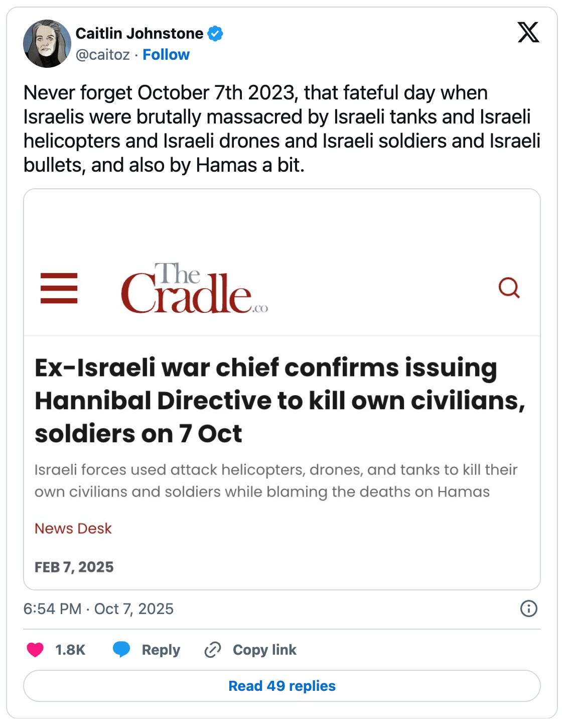And they don’t even want you looking at the day of October 7 too closely, either. Looking too closely at the events of that day bring up inconvenient questions about the Hannibal Directive and what percentage of the death toll was actually caused by the IDF firing on their own people. Inconvenient questions about the suspicious stock trading in the lead-up to the attack and the mountains upon mountains upon mountains of evidence that high-level Israeli officials allowed the attack to proceed undefended in order to advance the genocidal land grab we’re seeing advanced now.