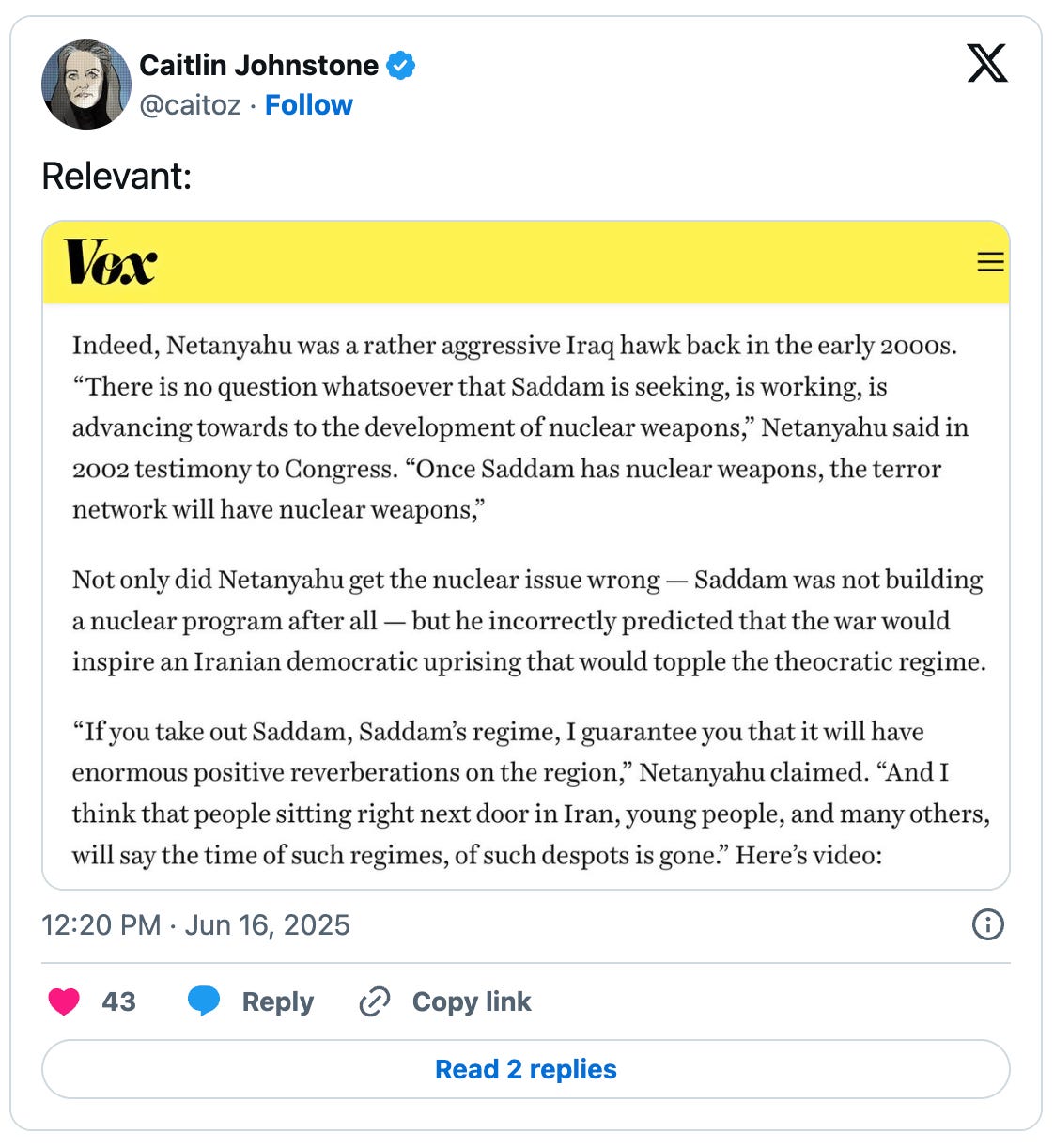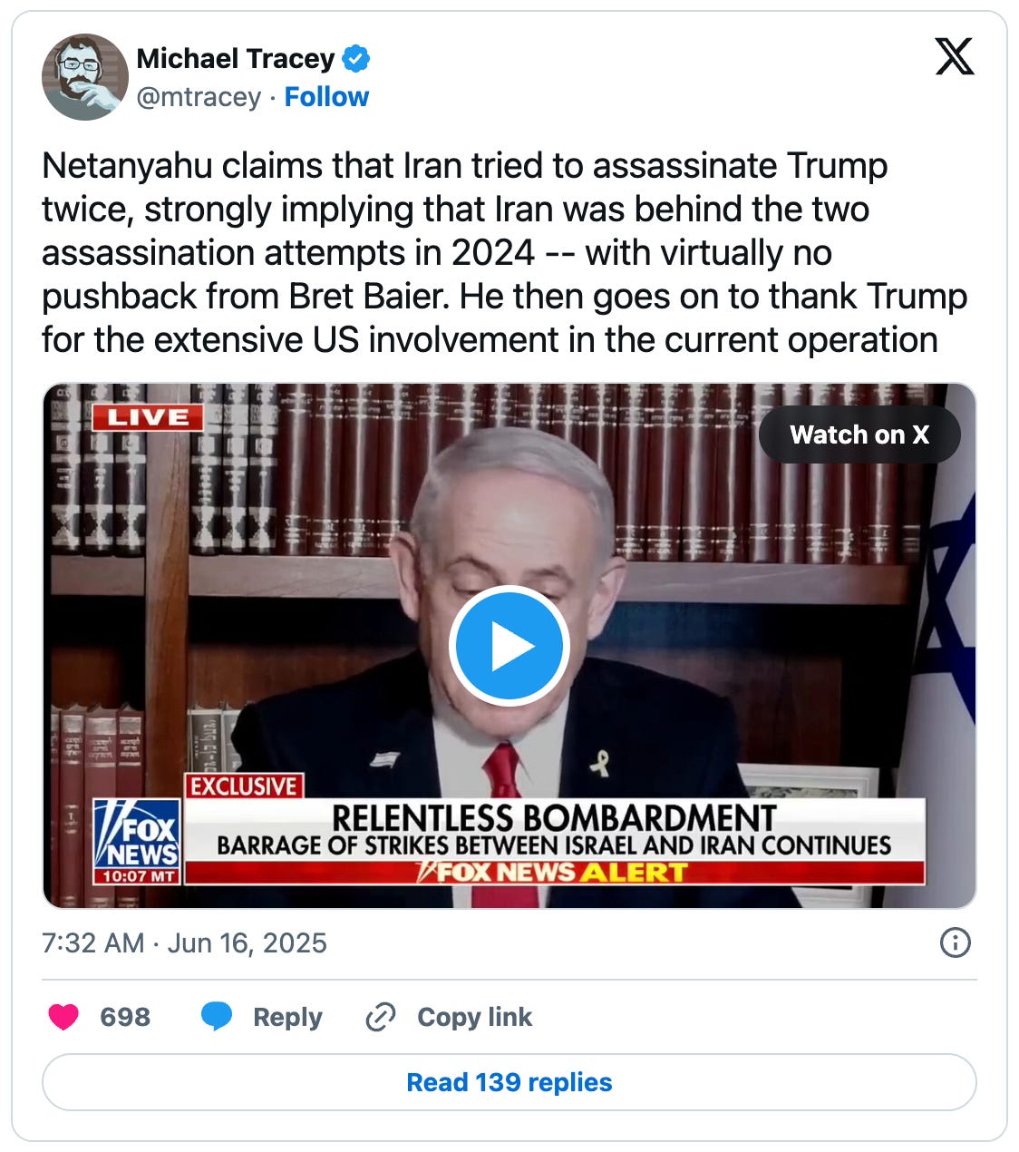 Netanyahu was fully aware that he was lying, and Baier was fully aware that Netanyahu was lying. They collaborated to push this lie before Fox News’ aging audience without the faintest whisper of journalistic ethics anywhere to be heard, knowing that this one baseless assertion would help turn their Trump-sympathizing viewers toward supporting a US attack on Iran.