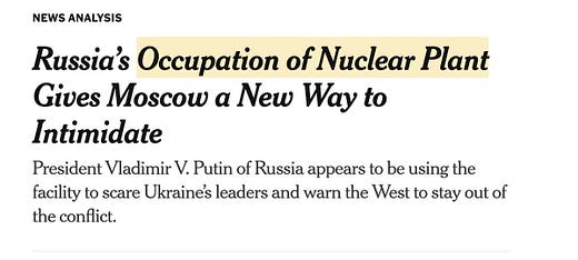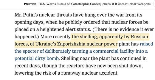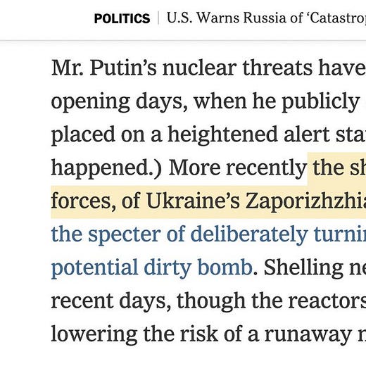 This is after all the same madman who the New York Times informs us has been ordering his troops to shell a nuclear power plant they already control. If Putin is a gibbering, irrational lunatic who enjoys blowing up his own stuff for no reason other than to act crazy, surely if we just stand back and leave him to his own devices he will soon turn the Russian Federation into a steaming pile of rubble.
