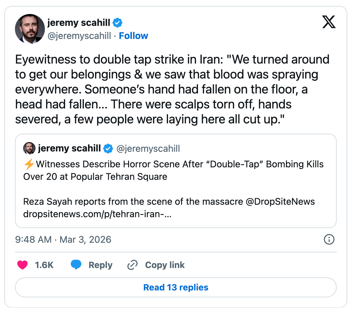 Drop Site News has a new article out which includes incredibly disturbing witness accounts of the carnage from a double-tap airstrike by the US-Israel alliance on a densely populated part of Tehran.