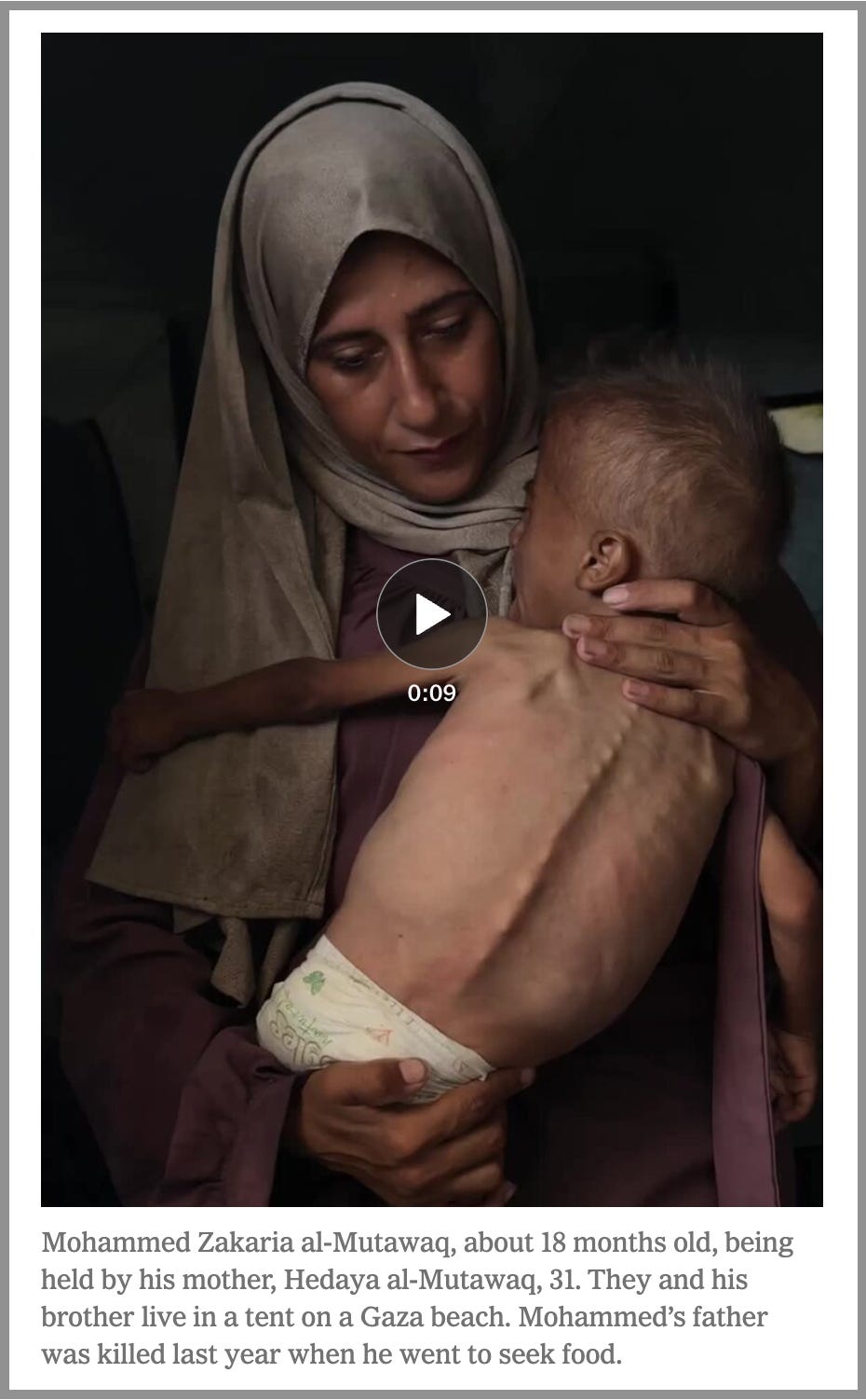 Any expert in the field will tell you that the first people likely to die in any famine will be young children, the elderly, and people with chronic health problems. Mohammed Zakaria al-Mutawaq is two of the three. Israel apologists are citing obvious evidence that Gaza is being starved and claiming it’s evidence that Gaza is not being starved, and bizarrely acting as though sick children being starved to death makes Israel look better instead of worse.