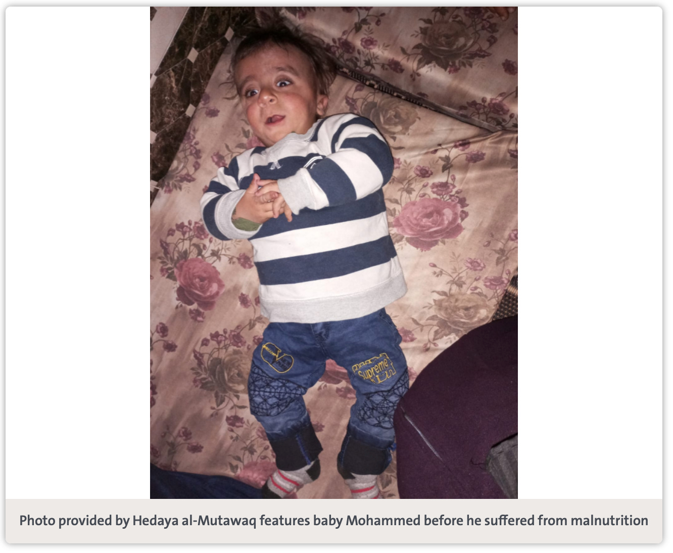 “She emphasized that Mohammed was healthy and of normal weight at birth. ‘Over the past four months of displacement, his condition worsened due to the severe shortage of food. That is when he developed acute malnutrition.’