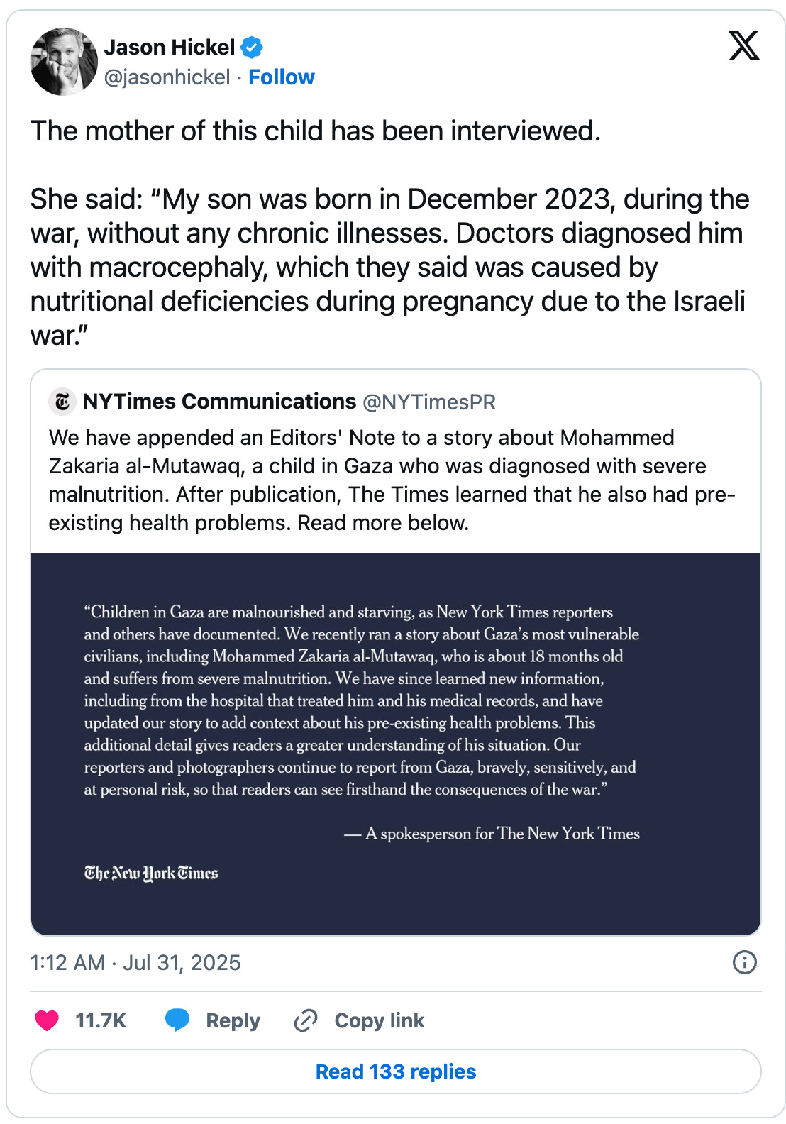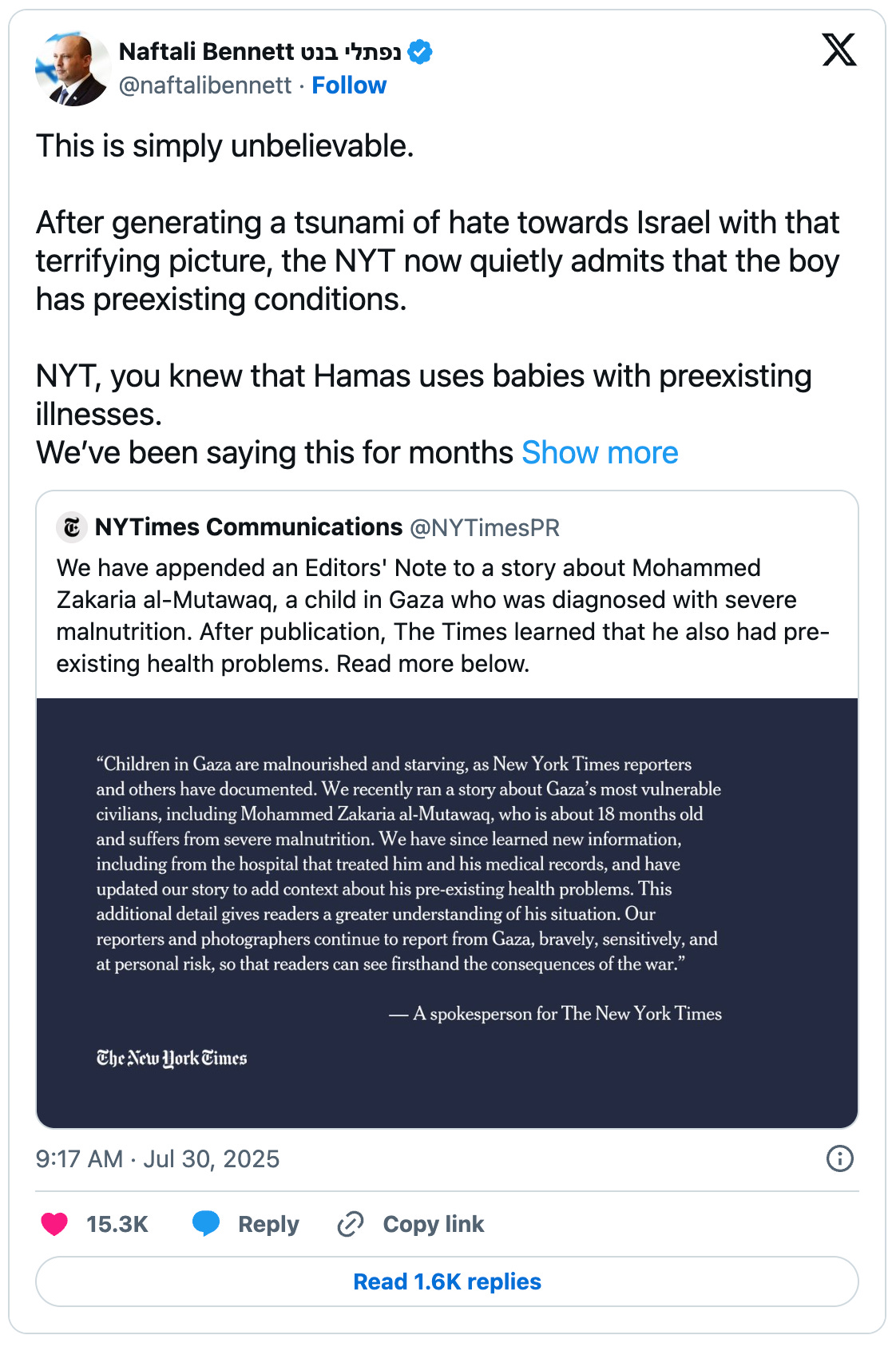 On Wednesday, The New York Times posted an editor’s note on an article it had published the previous Friday which included a horrifying photo of an emaciated child named Mohammed Zakaria al-Mutawaq. Caving to pressure from Zionists and influence ops like the Israeli propaganda outlet HonestReporting, the Times went out of its way to clarify that al-Mutawaq “had pre-existing health problems,” which Israel apologists instantly and predictably spun as proof that the media are lying about Israel starving Gaza.