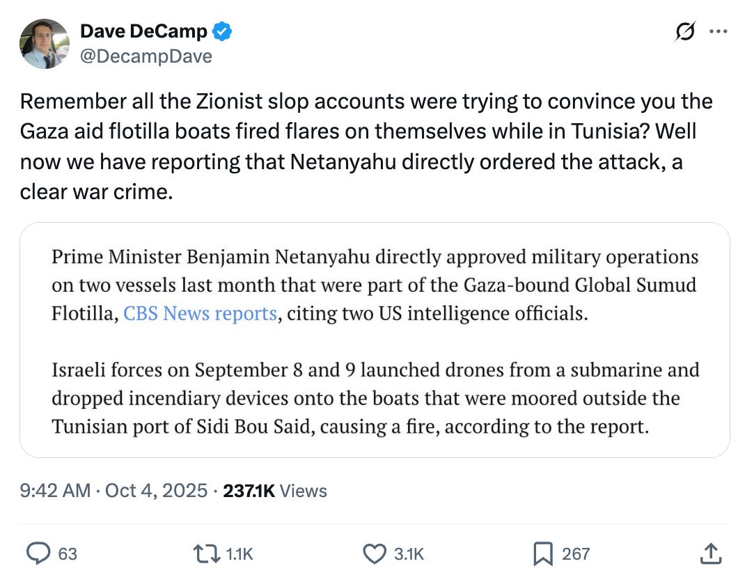 Odious genocide propagandist Eyal Yakoby got nearly ten million views on a tweet where he falsely claimed to have video evidence showing that the fire was actually the result of a misfired flare from one of the boat’s crew members. Anyone who’d actually watched the video would have seen that it showed nothing of the sort, but because Yakoby inserted a narrative above the video claiming it shows that, I had people in my Twitter notifications telling me for days that it had been conclusively proven the fire was started by a flare.