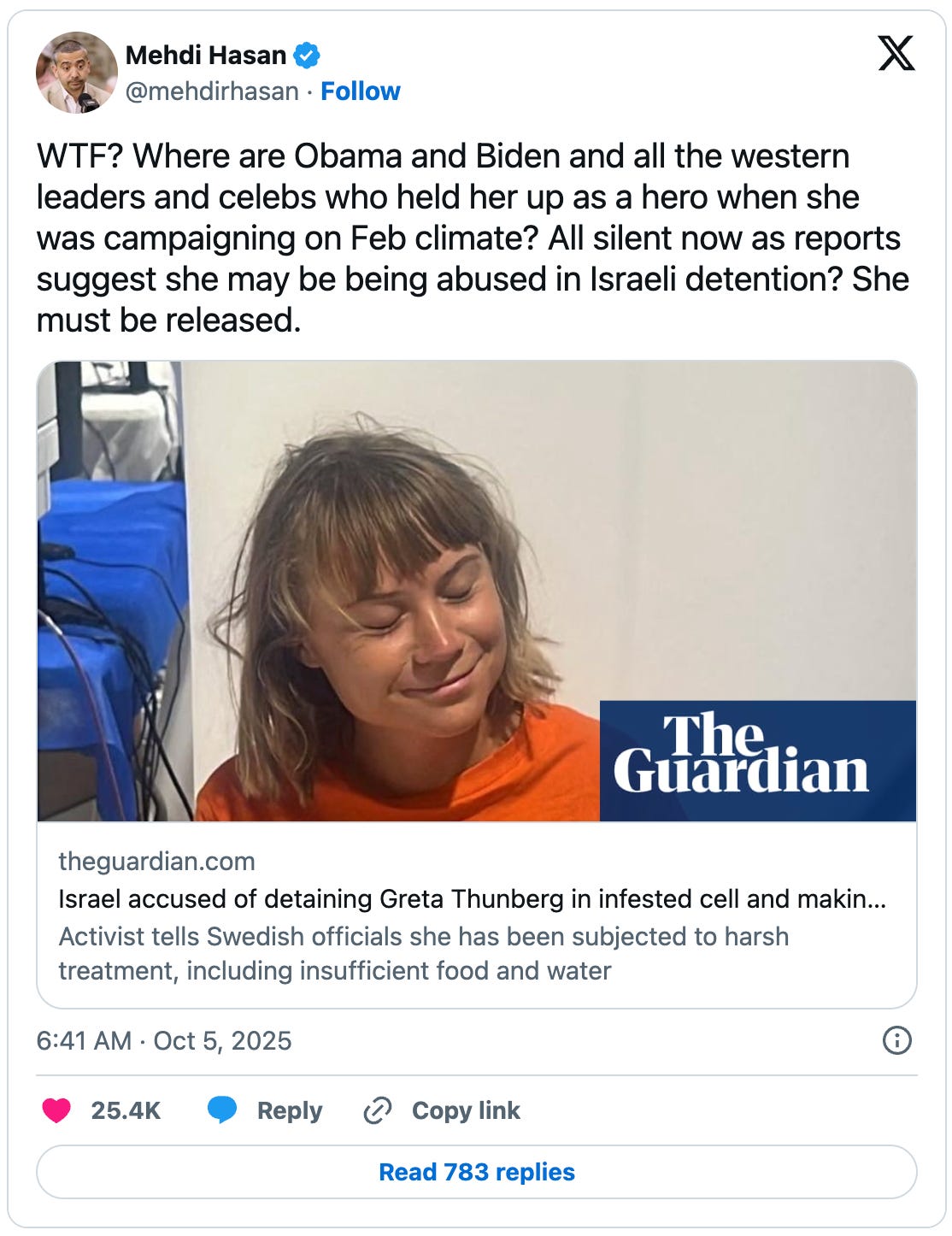And Greta. Lauded as an environmentalist, ignored as an activist for Palestinian rights. What a sickening double standard.