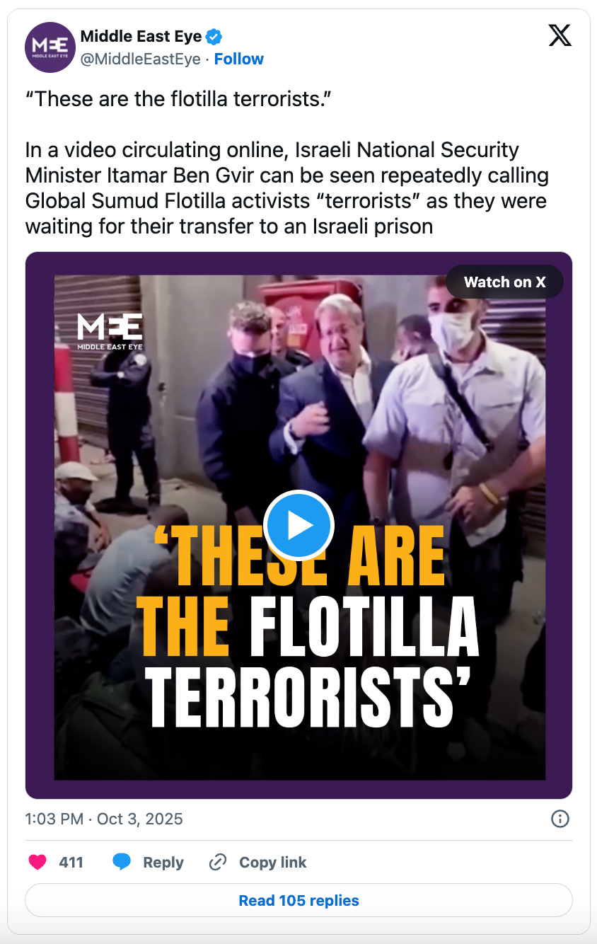 Israeli National Security Minister Itamar Ben-Gvir said last month that Sumud activists must be treated as terrorists in order to “create a clear deterrent” from future flotilla activism, declaring that “Anyone who chooses to collaborate with Hamas and support terrorism will meet a firm and unyielding response from Israel.”