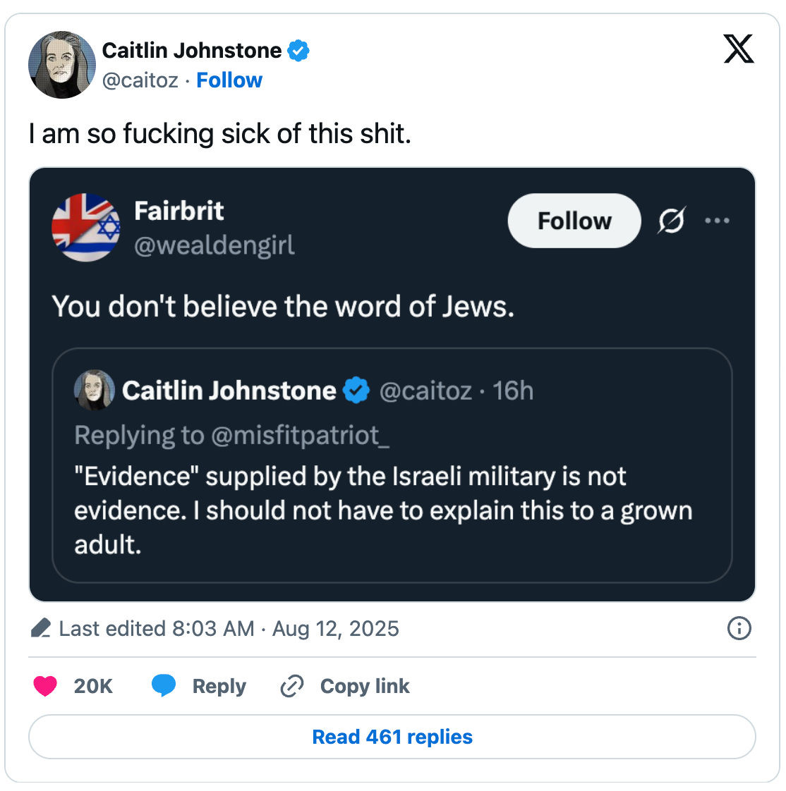 The hasbara machine hasn’t come up with a counter-argument for this. They hate it. Whenever I use it they always try to push the debate in some other direction where they have a counter-argument they’ve been trained to regurgitate, but when I stick to the universal consensus among human rights groups they always get mad and rage quit.