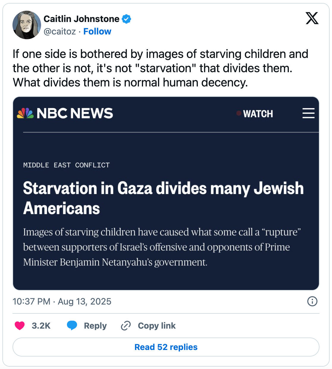 The second lesson here is that our “leaders” are not actually our leaders. We are leading them on the most important moral issue of our time, and they are following us. It is an absolute certainty that western governments and media would be ignoring Gaza if the public had ignored it too. They definitely wanted us to ignore it, and for a long time it really seemed like they expected us to get exhausted and drop it. It wasn’t until we made it clear that this isn’t getting shuffled down the memory hole with the daily news churn that we really began to see things change.