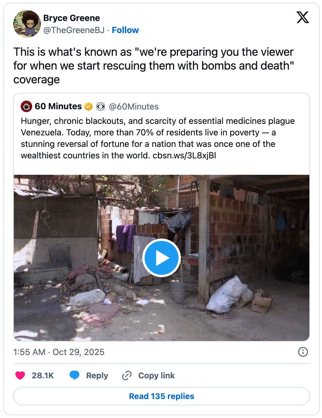 CBS News’ 60 Minutes has released a cartoonishly blatant war propaganda piece on “Nicolas Maduro, Venezuela’s dictator” about how poor and unhappy the people of Venezuela are under their current government. The piece featured an interview with Republican Senator Rick Scott, who said that “If I was Maduro I’d head to Russia or China right now; his days are numbered.”