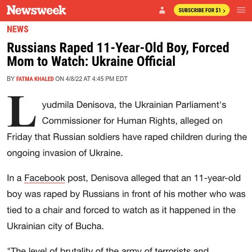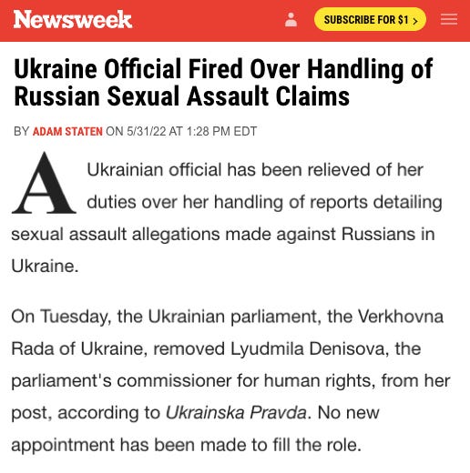 In April of this year Newsweek published an article titled "Russians Raped 11-Year-Old Boy, Forced Mom to Watch: Ukraine Official." In May of this year Newsweek published an article titled "Ukraine Official Fired Over Handling of Russian Sexual Assault Claims." It was the same official. Newsweek made no mention of the fact that its source for its sexual assault story had just been fired for disseminating unevidenced claims about sexual assault. To this day its April report contains no updates or corrections.