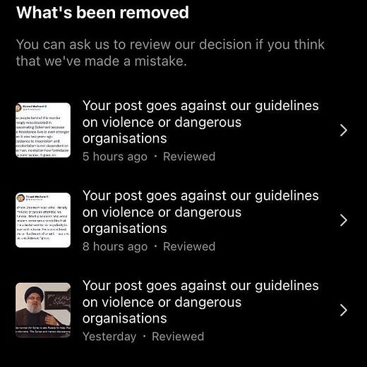 Go ahead and read the thread; here's the hyperlink again. There's nothing in there that comes anywhere remotely close to violating Instagram's terms of service as they are written; Medhurst condemns the assassination and the bogus justifications provided for it, and discusses Soleimani's crucial role in the fight against ISIS and Al Qaeda. The reason for Instagram's censorship of Medhurst's political speech is that Instagram's parent company Meta (then called Facebook) determined after Soleimani's assassination that anything which seems supportive of him constitutes a violation of US sanctions and must therefore be removed.