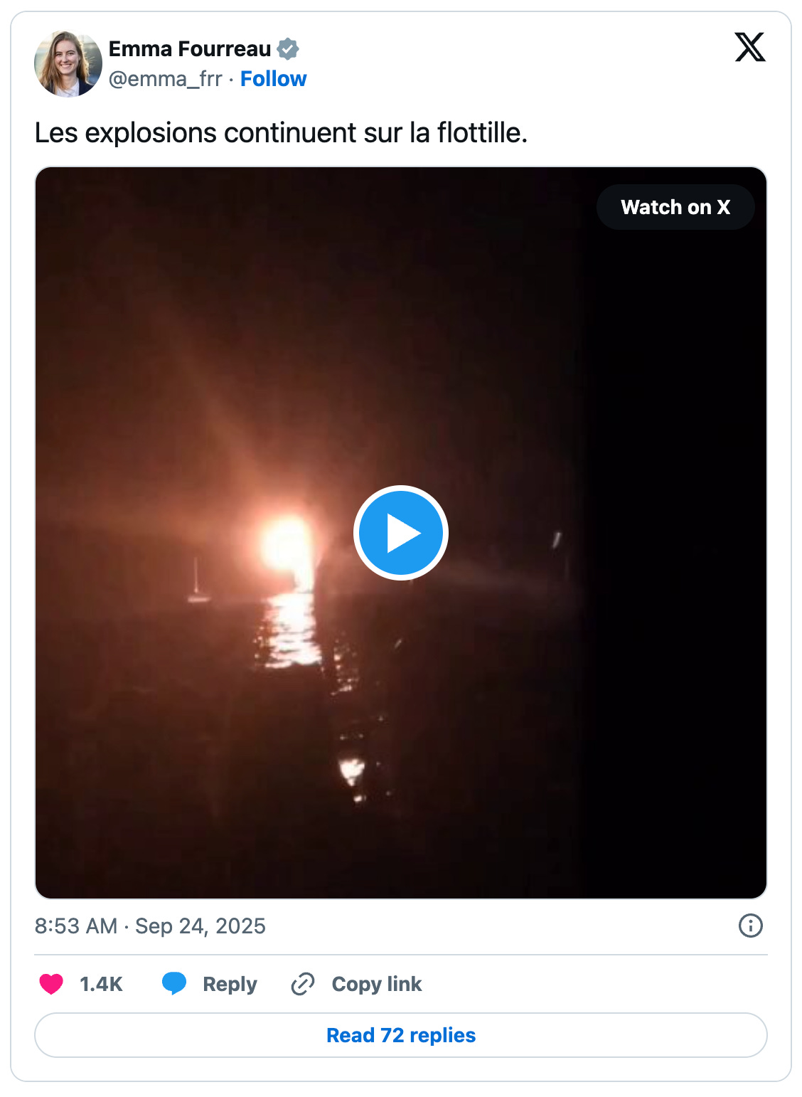The Global Sumud Flotilla which is bringing aid to break the Israeli siege on Gaza has once again come under attack. Activists say drones are dropping explosive objects which have reportedly burned the arm of one crew member and destroyed the main mast of one of the boats.
