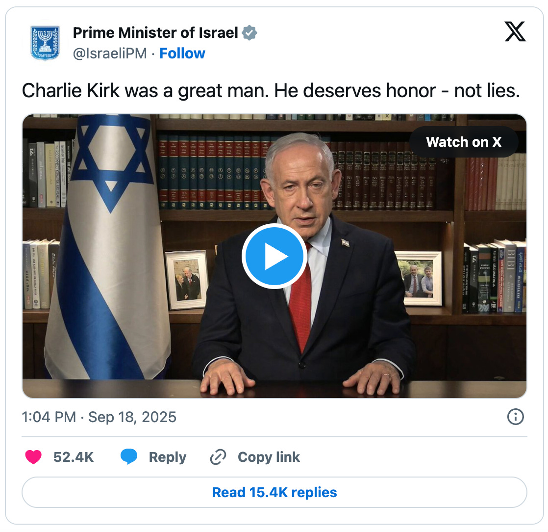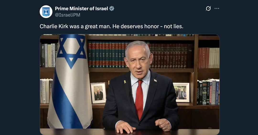 One of the weirdest things happening right now is how Israel’s prime minister keeps going out of his way to make public statements saying that Israel was definitely not behind the assassination of Charlie Kirk.