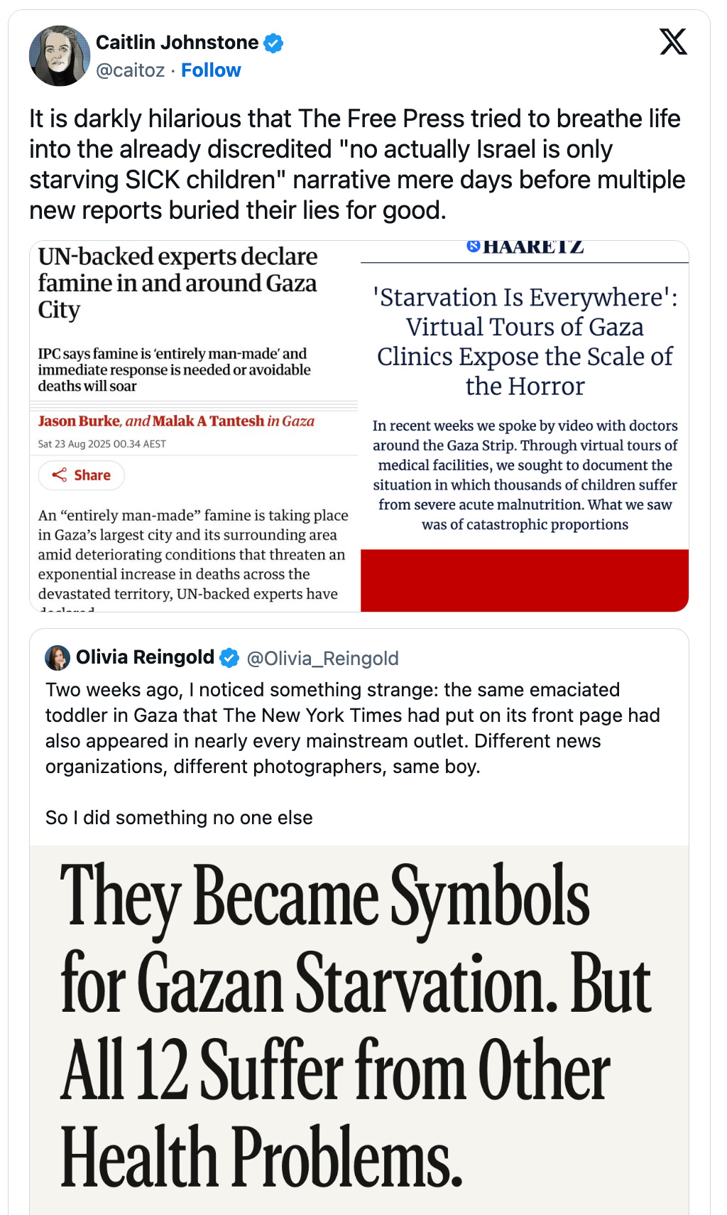 They tried to claim that the skeletal children we’re seeing in Gaza looked that way because of pre-existing conditions, then the Israeli press published an extensive report showing that children with no pre-existing conditions are being starved.
