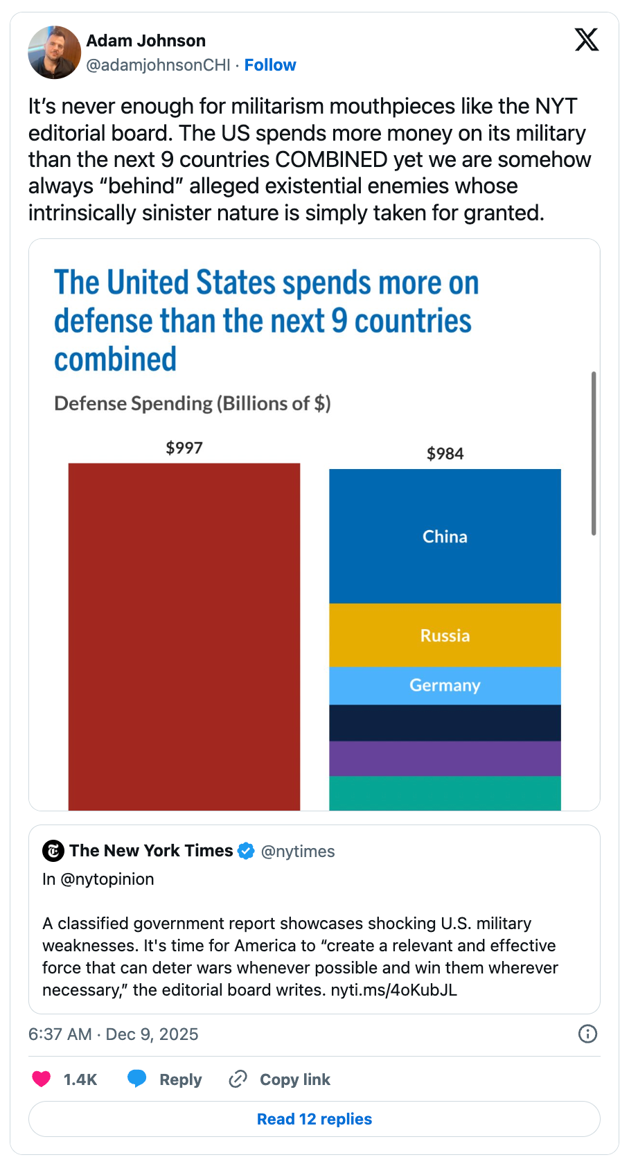 “In the short term, the transformation of the American military may require additional spending, primarily to rebuild our industrial base. As a share of the economy, defense spending today — about 3.4 percent of G.D.P. — remains near its lowest level in more than 80 years, even after Mr. Trump’s recent increases,” the Times writes, adding that US allies should also be pressured to ramp up spending on the war machine.