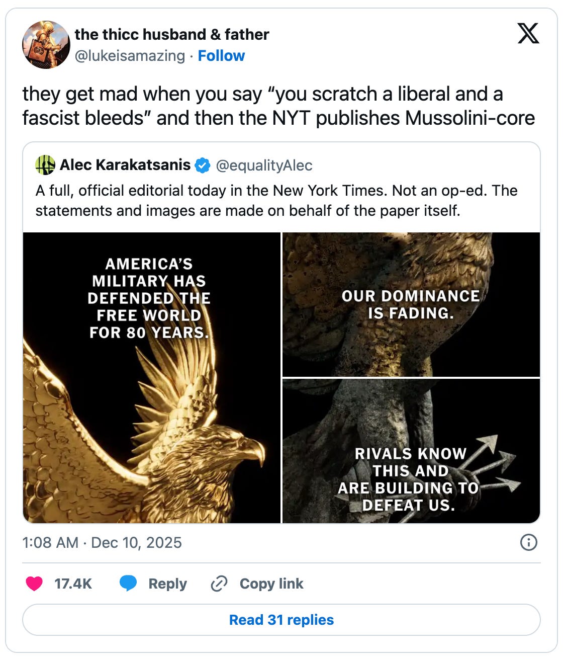 The article opens with graphics I saw one commenter describe as “Mussolini-core” because of their conspicuously fascistic aesthetic, accompanied by three lines of text in all-caps which reads as follows: