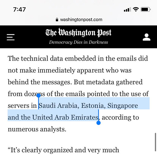I can't even begin to count the number of Democratic lists I've unsubscribed to during this election season, so suggesting that voter registration lists must be obtained through hacking is bonkers. Furthermore, to list Saudi Arabia, Estonia, Singapore and the United Arab Emirates, all Imperial vassals, as the network hubs distributing threatening emails is risible.
