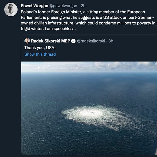 Someone who believes the US or its proxies sabotaged the Nord Stream pipelines can tell you exactly what they'd stand to gain from it and how little it would cost them. Someone who believes it was Russia has to perform weird mental contortions about Moscow sending some kind of message to the world and Putin being insane, or entertain the absurd notion that Russia could only stop Europe from obtaining Russian natural gas by destroying Russian pipelines. This says a lot about whose arguments are stronger.