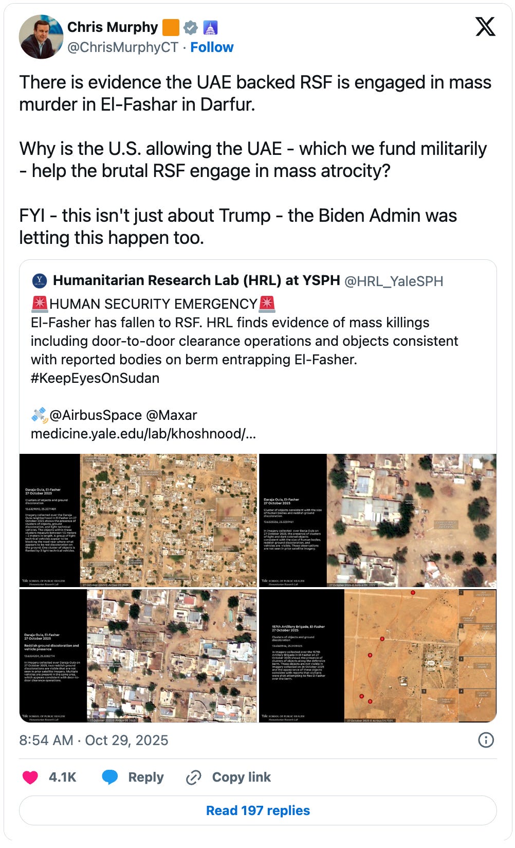The ongoing nightmare in Sudan is largely a product of the abuses of the western empire. The UAE is an imperial client state who the US and its allies recently supported in its years-long genocidal war on Yemen in partnership with Saudi Arabia. There are all kinds of threads you can trace back to western allies and partners in this genocide, as is the case for most of the worst things that happen in our world these days.