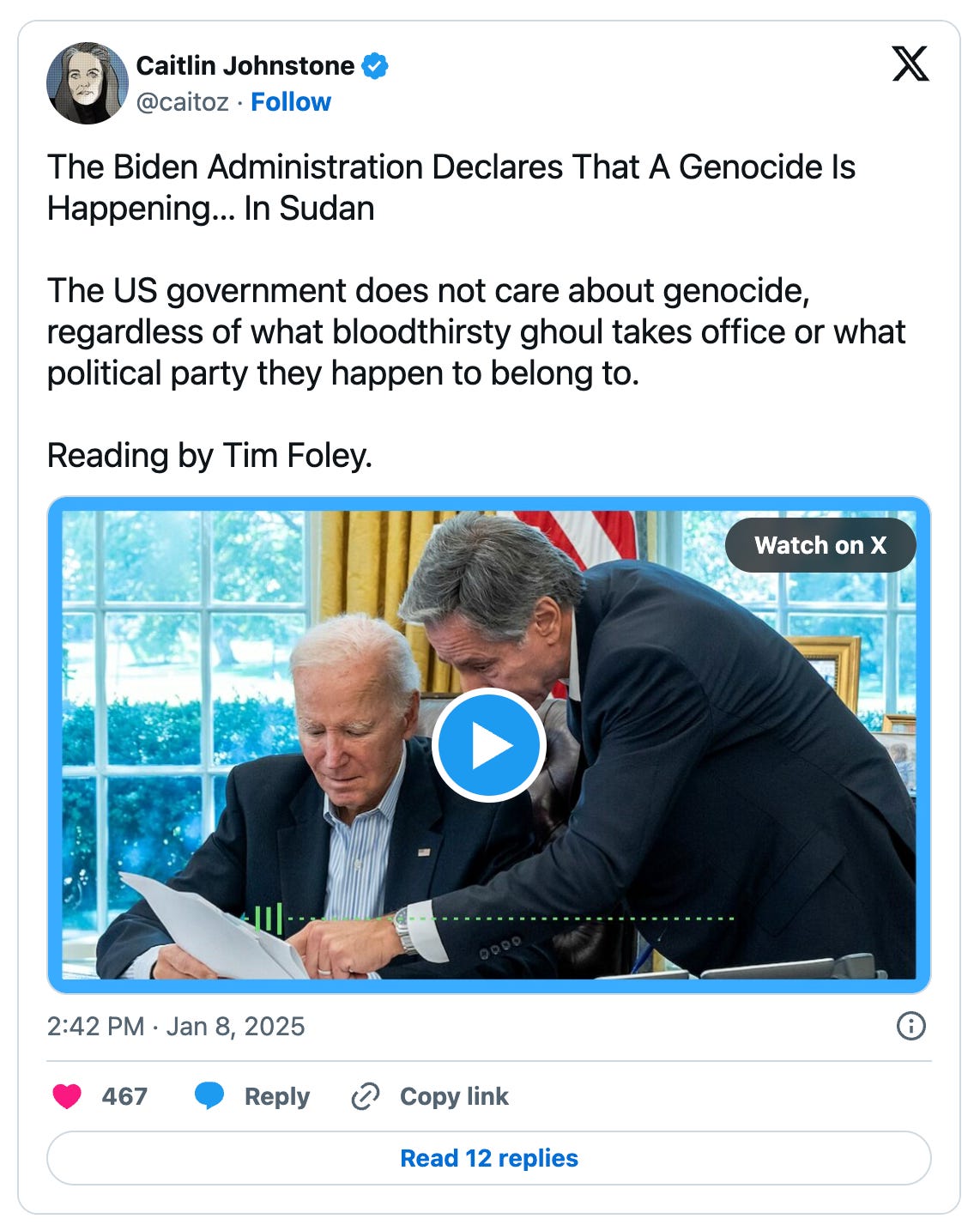 But it’s clearly different. Clearly. The evidence for this is in the extent to which western institutions have been protecting the genocide in Gaza versus the genocide in Sudan. Israel’s abuses are much more intimately interwoven into the guts of the imperial machine than those of the RSF, who Washington will take a blowtorch to the instant it becomes geopolitically advantageous.