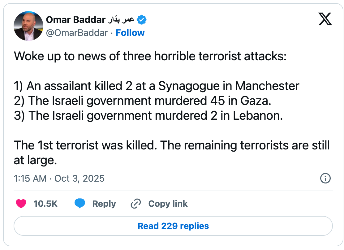 I wish the attack on the Manchester synagogue had never happened. I also feel weird about even talking about it while dozens of Palestinians are killed today whose individual names I’ll never know and whose individual deaths I’ll never see decried in western media headlines.