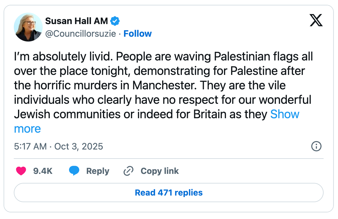 Wow ... murder of two "wonderful" jews is "horrific" but murdering 100,000+ unarmed women and children in Gaza is OK. Susan Hall a typical arrogant fascist sick fuck and hater who thinks one jewish life is worth 10,000 Palestinian babies. Dehumanizing Palestinians and open discriminatory narratives are the big part of the western propaganda. West (UK especially) can no longer hide its genocidal imperialistic supremacist anti-human ideology.