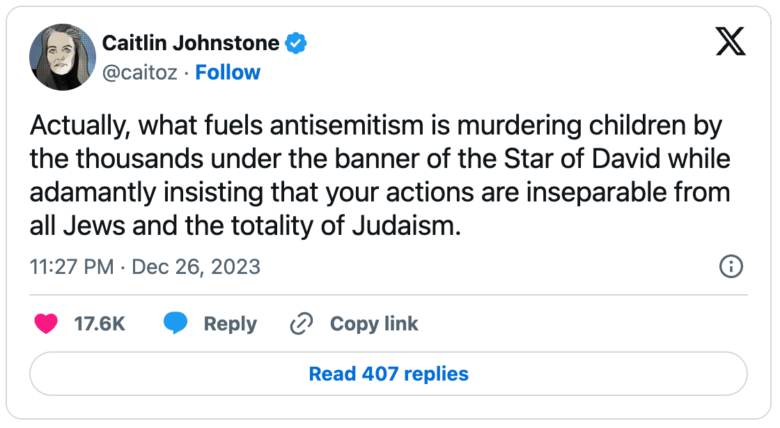 Back in December 2023 I wrote that “Actually, what fuels antisemitism is murdering children by the thousands under the banner of the Star of David while adamantly insisting that your actions are inseparable from all Jews and the totality of Judaism.”