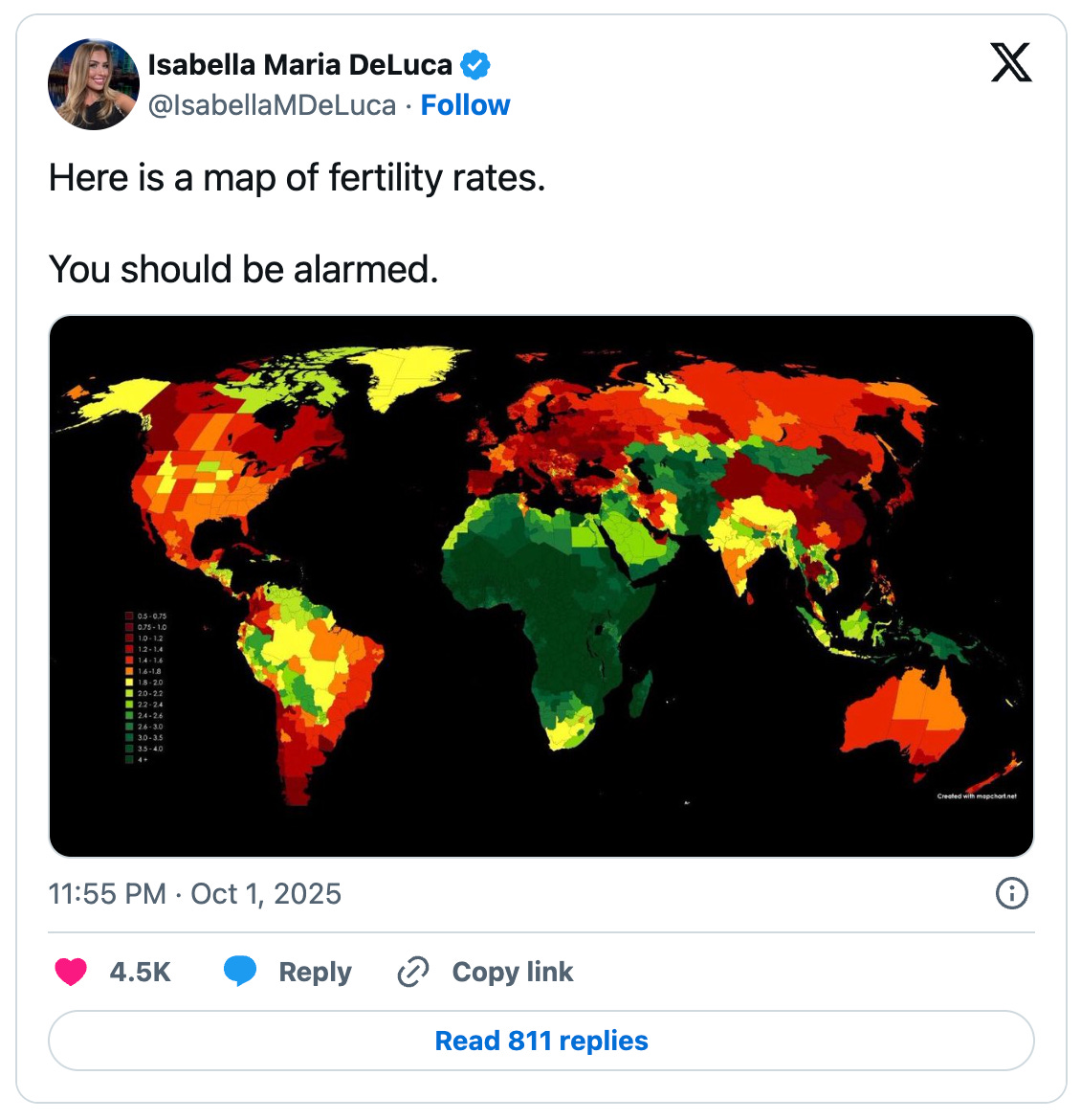 It’s funny how white supremacists freak out about global birth rates, because it’s just the result of white supremacism getting everything it wanted. Whites spent centuries extracting wealth from the global south, and it turns out fertility rates decline the wealthier a population becomes. They plundered and exploited and enslaved and extracted from the darker-skinned people whom they viewed as inferior, and now those populations are the only ones reproducing at above replacement levels.