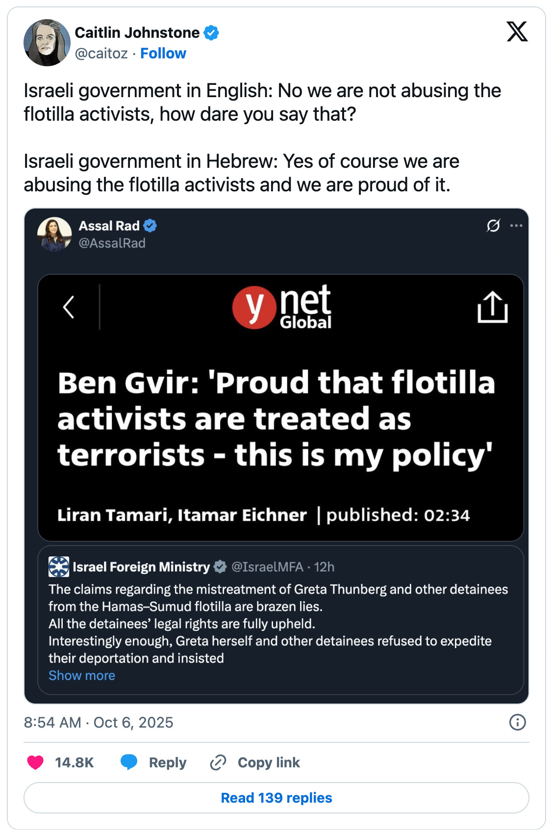 I don’t enjoy mocking and dismissing people who try to harness sympathy for October 7. It wasn’t particularly fun raining on the big sympathy parade the hasbarists threw for the second anniversary as they make a desperate effort to win back some of the global support they’ve been hemorrhaging all year. That’s just what you need to do when people are using something to facilitate crimes against humanity. It would be irresponsible to do otherwise.