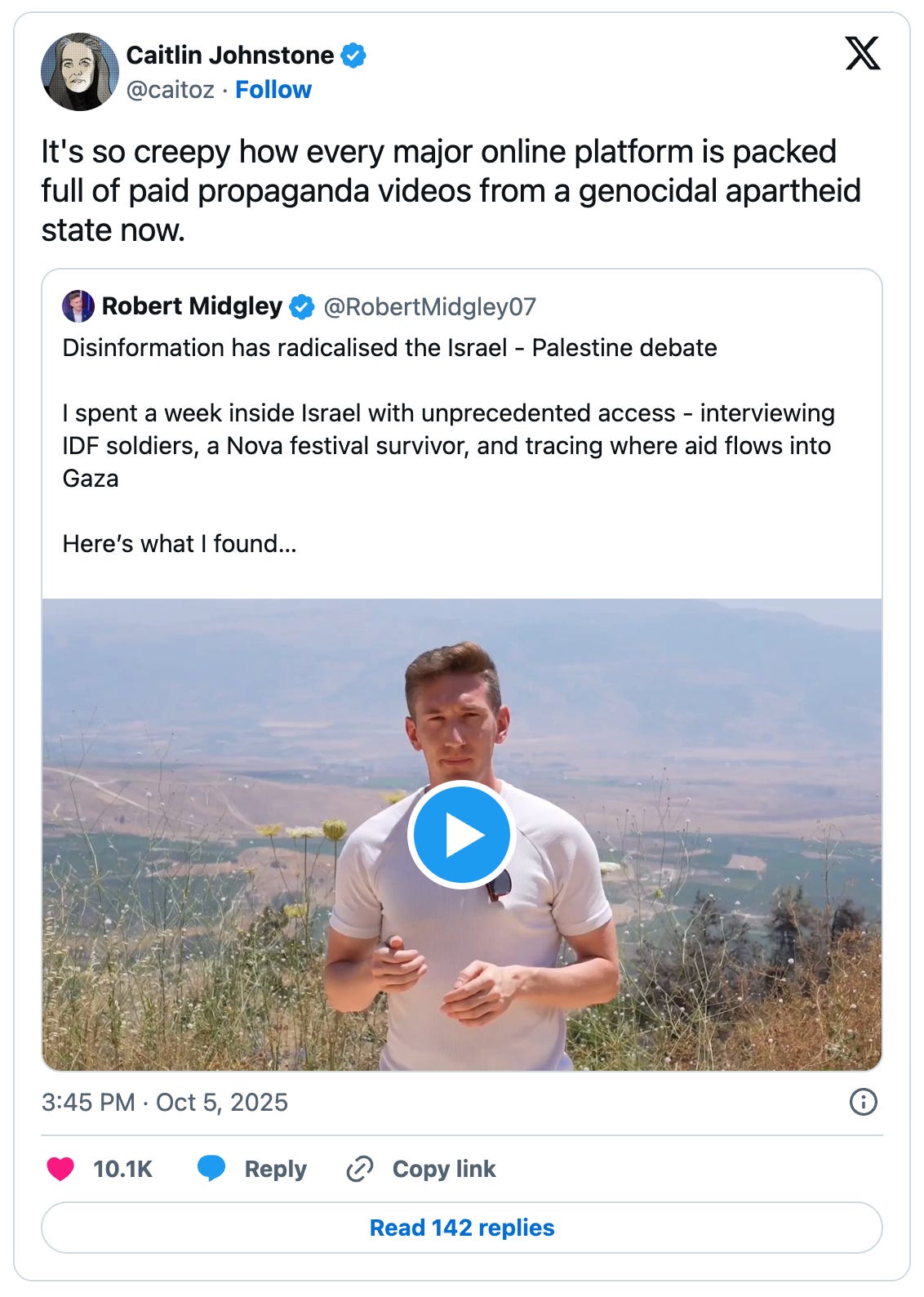 This is one of the ugliest, nastiest pieces of western media propaganda about the Gaza holocaust that I have ever seen, and we’re two whole years in. Only someone who thinks “dead Gaza baby” is a hilarious punchline would believe people need to be tricked by foreign influence campaigns into caring about dead babies in Gaza.