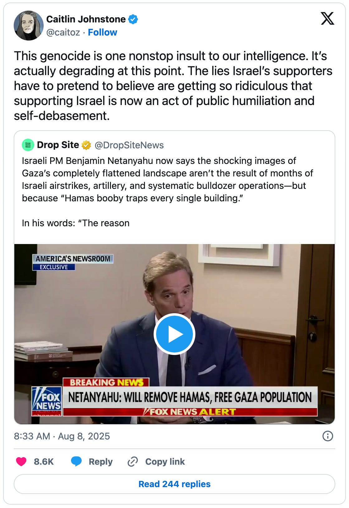 We need to make Israel and its supporters own the shame of their lies. When you’ve got Netanyahu telling Fox News that Gaza looks the way it looks because Hamas put explosives inside “every single building”, that’s the kind of lie that’s meant to humiliate you. It’s commanding a slave to believe two plus two equals five just to demonstrate how completely dominated they are.