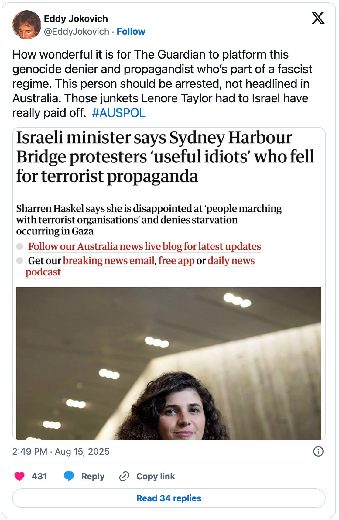 Haskel’s statements were then picked up and printed in outlets like The Guardian, quoting at length her lies denying Israel’s deliberate starvation of Palestinians and her assertion that anti-genocide protesters are “useful idiots” who fell for “terrorist propaganda”.