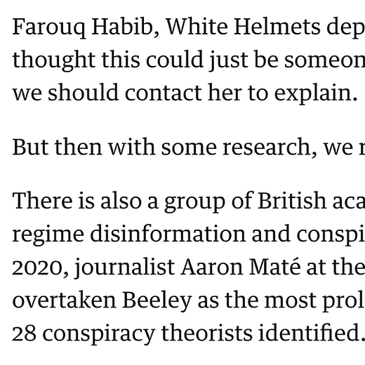 Your next clue that you're reading a very, very obvious piece of empire propaganda is that the article's author Mark Townsend makes no attempt to justify his claims. He names a few people he claims are guilty of "disseminating disinformation" like Vanessa Beeley, Eva Bartlett and Aaron Maté, but, rather than presenting arguments and evidence that the claims those individuals have circulated are false, he simply asserts that it is so and moves on.